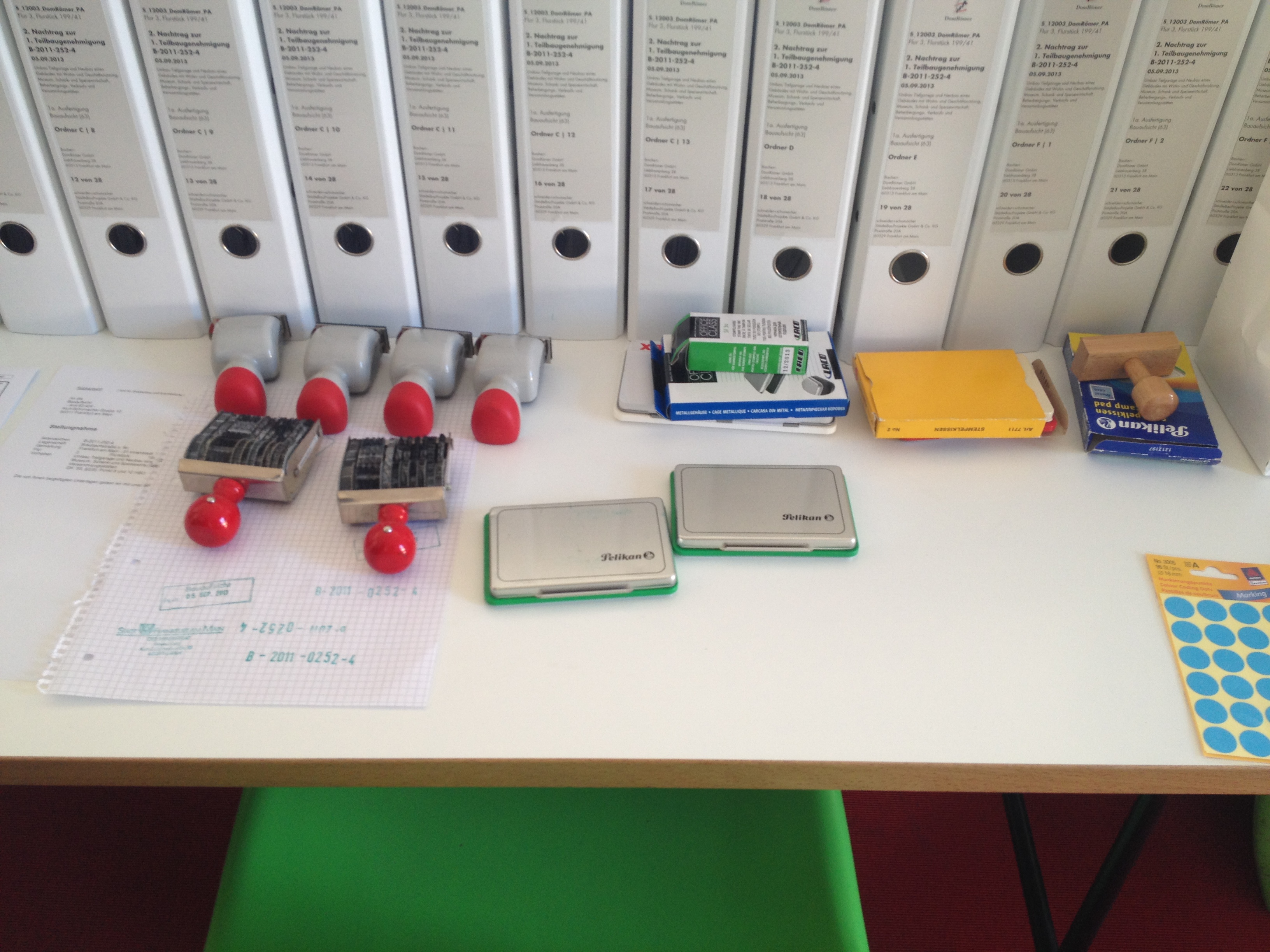• Jede Menge Ordner für den Bauantrag 28 Ordner ohne die statische Berechnung. Dieser wurde 6-fach eingereicht. Insgesamt handelt es sich um 168 Ordner.